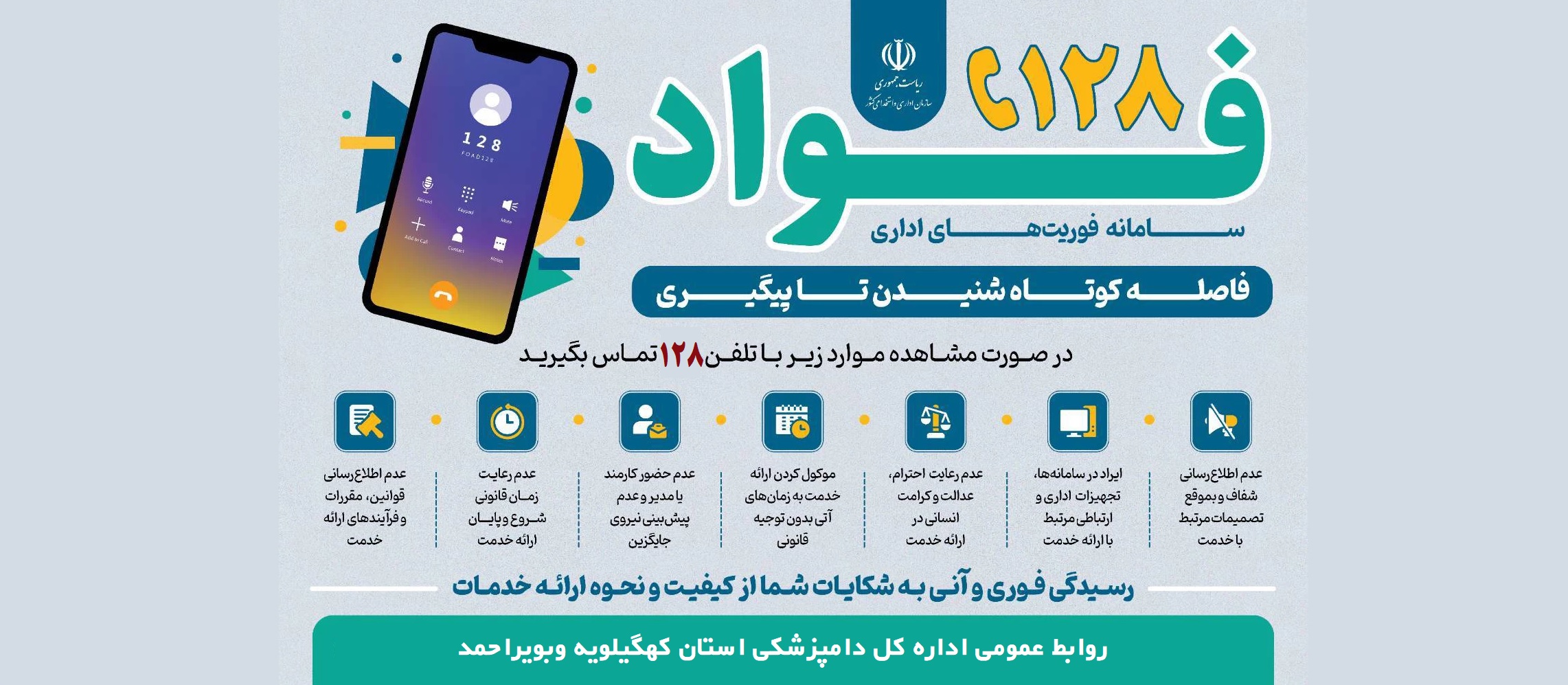 به گزارش روابط عمومی اداره کل دامپزشکی استان ، سامانه فواد و شماره تلفن ۱۲۸، بستری برای ثبت و پیگیری فوری مشکلات، شکایات و نارضایتی‌های شهروندان، خدمت‌گیرندگان و کارکنان درباره نحوه ارائه خدمات، رفتار کارمندان و کیفیت پاسخگویی در دستگاه‌های اجرایی استان است.راهبری سامانه فواد بر عهده مرکز بازرسی، نظارت بر خدمات عمومی و فوریت‌های اداری سازمان اداری و استخدامی کشور بوده و این مرکز از طریق ارجاع مستقیم به واحدهای بازرسی، ارزیابی عملکرد و رسیدگی به شکایات دستگاه‌های اجرایی و پیگیری تا حصول نتیجه نهایی را بر عهده دارد.تمامی شهروندان، ارباب رجوع، شرکت‌ها، سازمان‌ها و سایر ذی‌نفعان در سطح استان، می‌توانند مشکلات و نارضایتی‌های خود را از طریق این سامانه یا شماره تلفن ۱۲۸ ثبت و پیگیری کنند .پس از ثبت، یک کد رهگیری برای پیگیری وضعیت درخواست به تماس‌گیرنده ارائه می‌شود.