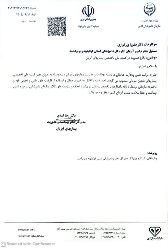 نظر به مراتب علمی و تجارب جنابعالی در زمینه بهداشت و مدیریت بیماری های آبزیان ، بدینوسیله به عنوان " عضو کمیته ملی تخصصی بیماری های ماهیان سردآبی منصوب می شوید. امید است با اتکال به خداوند متعال و استفاده از ظرفیت های علمی و تجربی خود و مجموعه سازمانی مرتبط ، با ارائه راهکارهای تخصصی و فنی در پیشبرد اهداف و سیاست های کلان سازمان دامپزشکی کشور در حوزه تامین بهداشت و حفظ سلامت صنعت آبزیان کشور موفق و موید باشید.